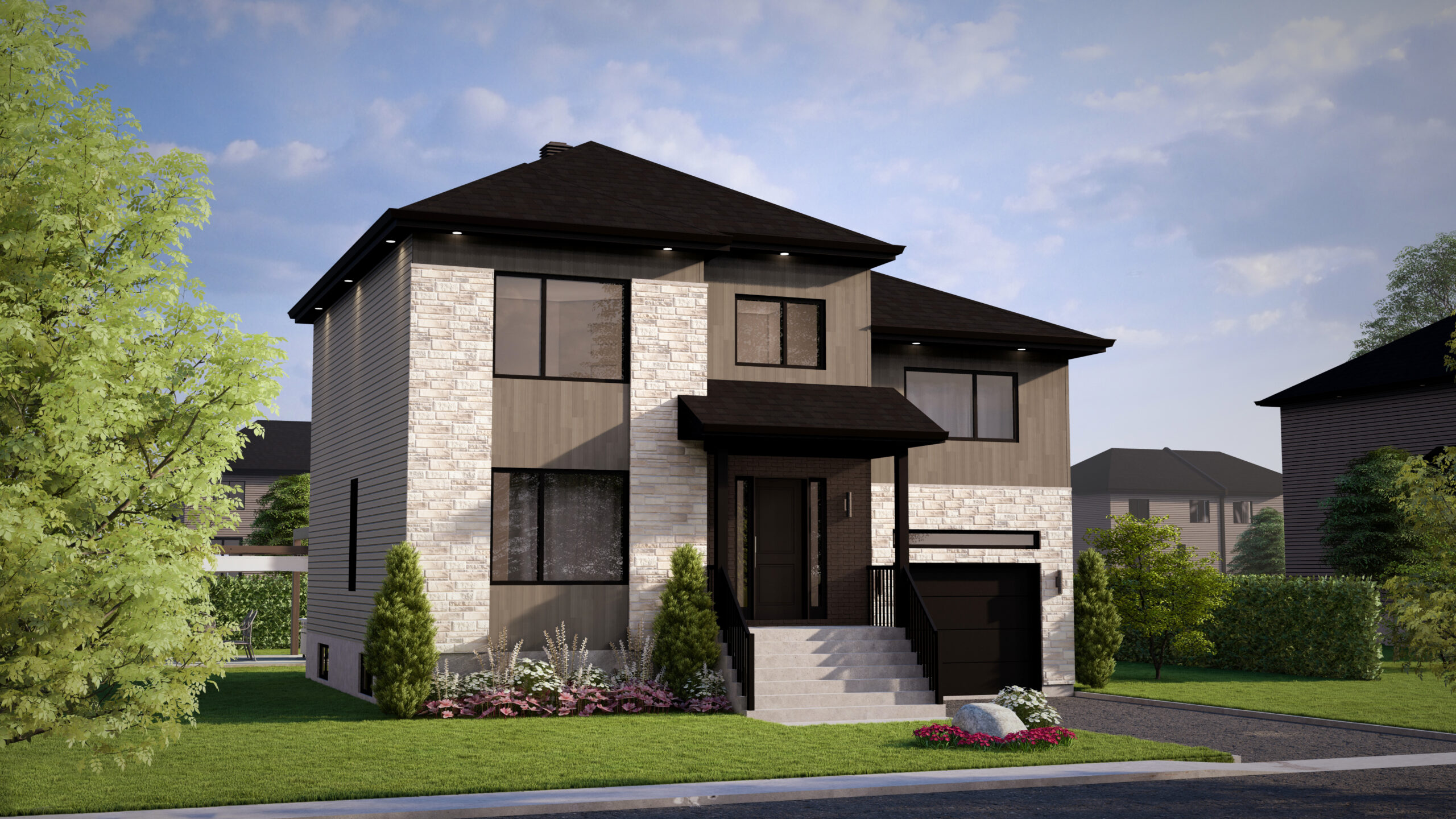 Nos finitions extérieures mettent en valeur l’architecture avec des matériaux durables et une esthétique maîtrisée, dès l’entrée de la maison.